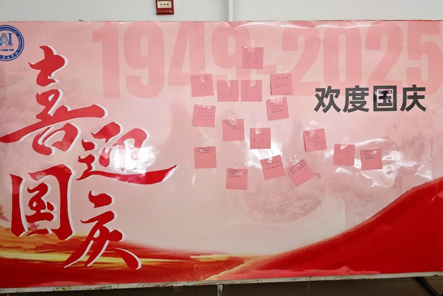 写下祝福后,同学们怀着激动的心情将便签贴在展板上。随着便签逐渐铺满展板,原本空白的区域变成了一片色彩斑斓的“祝福海洋”,如同无数颗炽热的 “中国心” 紧紧相依。活动结束后,师生纷纷驻足观看,拍照留念,现场洋溢着浓厚的爱国氛围。
