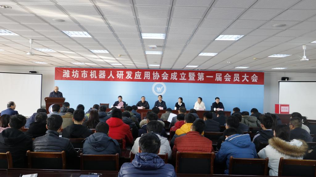 为了促进潍坊市机器人研究及开发,加强各高校、科研机构及企业之间的交流合作,提高潍坊市机器人自主研发能力,加快潍坊市机器人产业发展步伐,整合及协调机器人产业资源,由太阳成集团tyc539、山东帅克机械制造股份有限公司、山东矿机集团股份有限公司、潍坊市六次方机器人科技有限公司、山东交通职业学院、潍坊学院等14家高校、企业以及60多位机器人专家共同发起,于2018年1月正式成立潍坊市机器人研发应用协会。